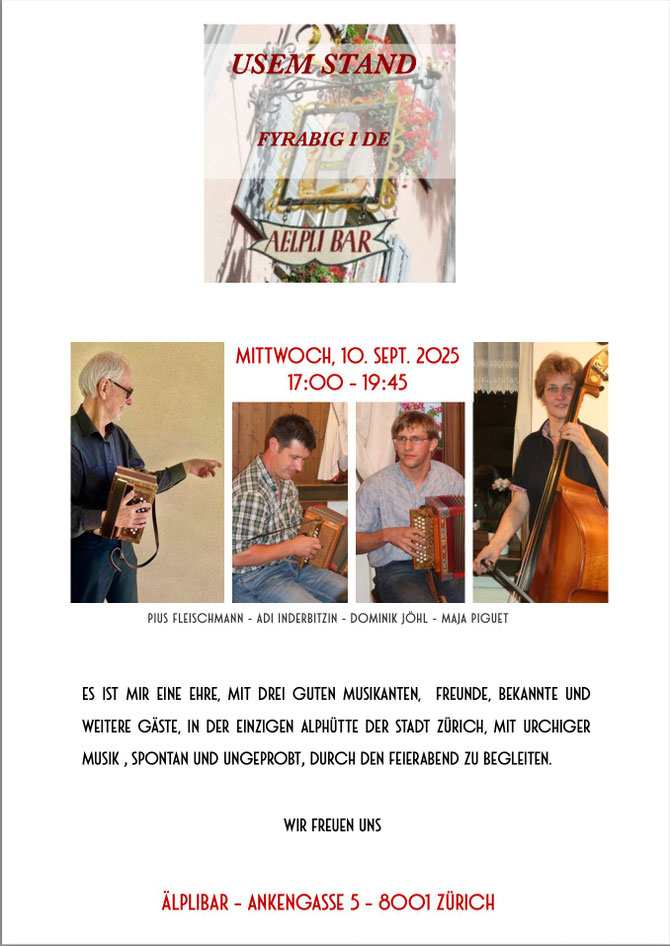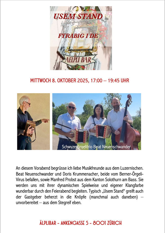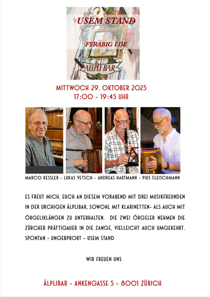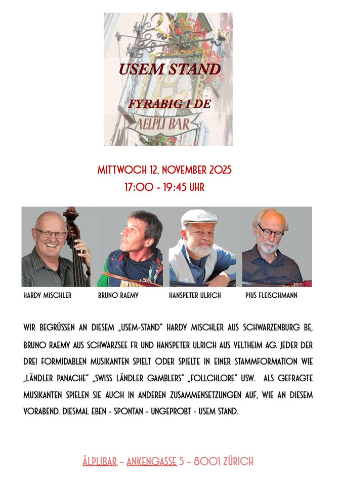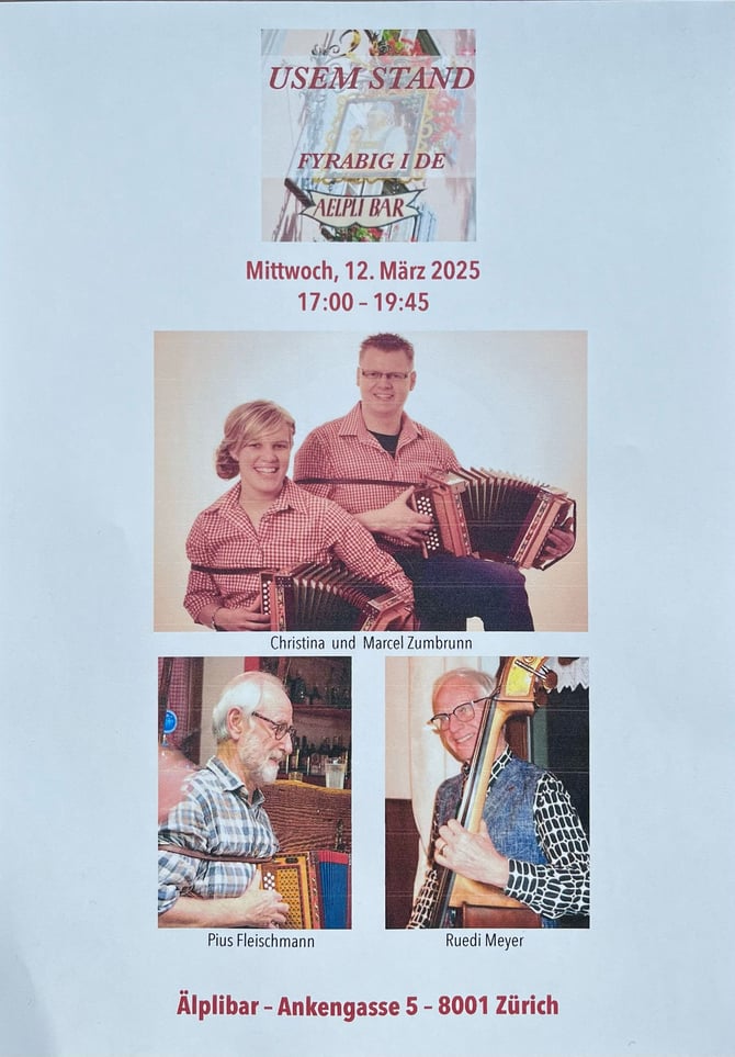 Hier die April „Usem Stand“ Veranstaltung mit zwei von den „Grischuna Örgeler“ als Hauptdarsteller.